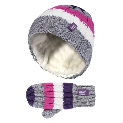 HEAT HOLDERS Kids Girls Fleece Lined Knitted Striped Colourful Winter Thermal Hat and Mittens Set (3 6 Years, PP1P12)