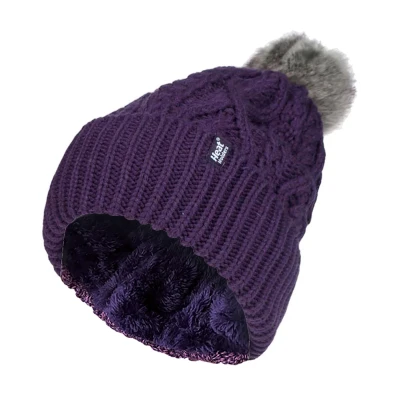 HEAT HOLDERS Ladies Chunky Ribbed Cuffed Thermal Winter Pom Bobble Beanie Hat with Fleece Lining (One Size, Purple (Solna))