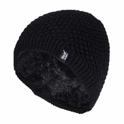 HEAT HOLDERS Ladies Crochet Knit Style Fleece Lined Warm Thermal Winter Beanie Hat (One Size, Black (Nora))