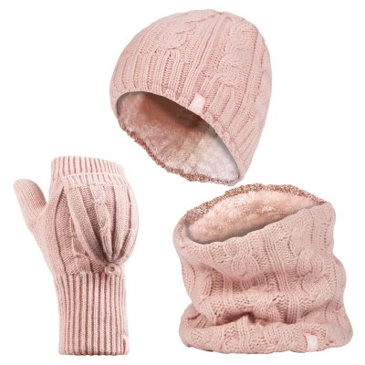 HEAT HOLDERS Ladies thermal winter warm fleece cable knit Hat, Neck Warmer and Converter Gloves set (Dusky Pink)