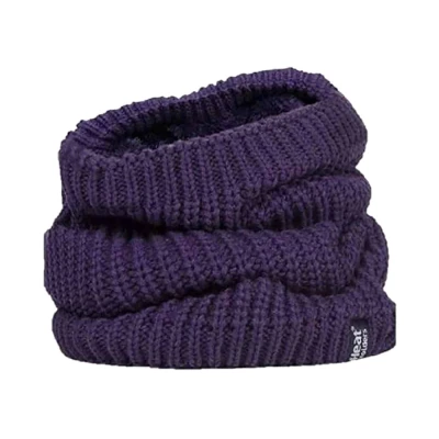 Warmer than a scarf and less trouble too, have you considered a neck warmer as the accessory to keep your neck warm instead of a scarf. This ladies Heat Holders chunky knit neck warmer is delightfully soft and warm, guaranteeing to engulf you in cosiness and warmth when the cold winter weather hits. The innovative Heat Weaver lining is the underlying secret as to why this neck warmer is so warm. It is a fur-like thermal lining that retains warm air designed to keep you warmer for longer. The advanced, high-performance Heat Holders insulating yarn built into this neck warmer also allows moisture to be wicked away from the neck warmer, especially helpful when you are trying to keep warm and dry on those wet miserable days. This chunky knit neck warmer covers more of your body as opposed to a traditional one. It is perfect for keeping warmth in around your head, throat and upper chest areas. These ladies chunky knit neck warmers are made from 100% acrylic on their outer and 100% polyester on their lining. They are available in 3 colours including black, purple and cream. They come in one size and they are machine washable..