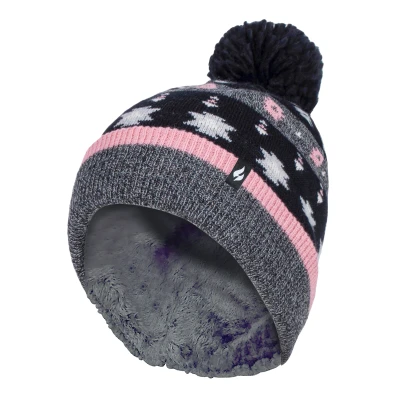 Like the original Heat Holders ladies pom pom hat but with a chunky knit and ribbed turnover cuff, these Alps & Rockies styled hats like the original aims to keep you cosy and warm whilst keeping you fashionable with their contemporary style and knit. These womens bobble hats have a fleece plush insulation lining, called Heatweaver, that is even more effective at holding warm air than any regular lining. This thermal lining is designed to be soft with a luxurious fleece feel (it almost feels like you’re touching the golden fleece) whilst holding warm air close to your skin, effectively keeping the cold air out. All of this is designed to ensure that you are toasty warm throughout the cold weather. This pom pom hat has a turn over cuff and a large faux fur fluffy pom pom on the top of the hat. This hat has a stylish and funky outer to give a fashionable touch. They come in 2 styles which consist of chucky stripes & a winter fairisle pattern and those styles have 2 colours available: Black/Grey & Grey/Pink. These ladies Heat Holders styled pom pom beanies are made from 100% Acrylic on the outside of the hat and the lining is made from 100% Polyester. They come in one size and are safely machine washable.