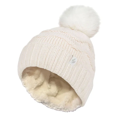 HEAT HOLDERS Ladies Winter Fur Beanie Hat Zigzag Patterned Pom Womens Thermal Cuff Bobble (One Size, Cream)