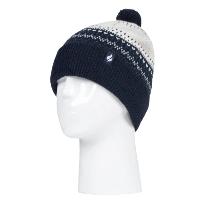 Like the original Heat Holders ladies bobble hat but with a funky pattern and turnover cuff, this Avon styled hat like the original aims to keep you cosy and warm whilst keeping you fashionable with their contemporary style, knit and smaller pom pom. These womens pom pom hats have a fleece plush insulation lining, called Heatweaver, that is even more effective at holding warm air than any regular lining. This thermal lining is designed to be soft with a luxurious fleece feel (it almost feels like you’re touching the golden fleece) whilst holding warm air close to your skin, effectively keeping the cold air out. All of this is designed to ensure that you are toasty warm throughout the cold weather. This pom pom hat has a ribbed turn over cuff and a smaller faux fur fluffy pom pom on the top of the hat. This hat has a funky and colourful pattern on its outer to give a fashionable touch. These ladies Avon hats are also perfect thermal hats and go with most outfits. These ladies Heat Holders Avon styled pom pom hats are available in 3 colours including Black/Cream, Navy/Cream & Purple/Cream. They are made from 100% Acrylic on the outside of the hat and the lining is made from 100% Polyester. They come in one size and they are safely machine washable.