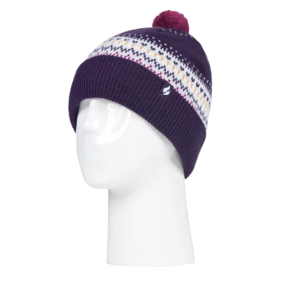 Like the original Heat Holders ladies bobble hat but with a funky pattern and turnover cuff, this Avon styled hat like the original aims to keep you cosy and warm whilst keeping you fashionable with their contemporary style, knit and smaller pom pom. These womens pom pom hats have a fleece plush insulation lining, called Heatweaver, that is even more effective at holding warm air than any regular lining. This thermal lining is designed to be soft with a luxurious fleece feel (it almost feels like you’re touching the golden fleece) whilst holding warm air close to your skin, effectively keeping the cold air out. All of this is designed to ensure that you are toasty warm throughout the cold weather. This pom pom hat has a ribbed turn over cuff and a smaller faux fur fluffy pom pom on the top of the hat. This hat has a funky and colourful pattern on its outer to give a fashionable touch. These ladies Avon hats are also perfect thermal hats and go with most outfits. These ladies Heat Holders Avon styled pom pom hats are available in 3 colours including Black/Cream, Navy/Cream & Purple/Cream. They are made from 100% Acrylic on the outside of the hat and the lining is made from 100% Polyester. They come in one size and they are safely machine washable.