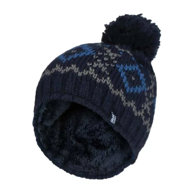 HEAT HOLDERS Mens Chunky Knit Fleece Lined Thermal Winter Warm Beanie Bobble Hat with Pom (One Size, Navy/Blue)