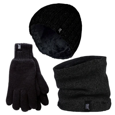 HEAT HOLDERS Mens Hat, Neck Warmer & Gloves Set Winter Knitted Warm Accessories (M L, Black)