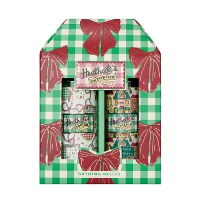This delightful Heathcote's Emporium Body Wash & Body Cream in Tin 100ml gift set features two bathing belles, a relaxing bath soak and a gentle body wash, beautifully presented in a cheerful carton adorned with festive gingham and bows. It’s the ideal treat for bath lovers and a thoughtful seasonal gift.Each product is lovingly formulated with skin-kind tulip flower extract and hydrating glycerin to leave skin feeling soft and pampered. The fragrance is a calming blend of eucalyptus, lavender, and patchouli essential oils, layered with fresh green leaves, delicate lily of the valley, and the warm embrace of sandalwood, perfect for a soothing bathing ritual.Swirl a generous handful of bath salts into warm water to release their relaxing aroma, then follow with the indulgent body wash for a gentle, luxurious cleanse. Each 100ml bottle features a unique festive design, from twinkling baubles and ribbons to charming shopfronts ready for Christmas. Compact and travel-friendly, they’re made using recycled plastic and are both cruelty-free and vegan.