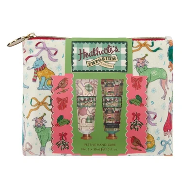 This Heathcote's Emporium Velvety Soft Hand Bag Essentials Hand Wash & Hand Cream in a soft velvet zip pouch, adorned with delightful illustrations of cosy cats and dogs dressed for winter. Inside, you’ll find an indulgent duo of vegan hand care essentials: a gentle hand wash and a velvety hand cream, both infused with signature seasonal fragrance.The scent is a calming blend of eucalyptus, lavender, and patchouli essential oils, uplifted by fresh green leaves, delicate lily of the valley, and the warmth of smooth sandalwood, bringing a touch of tranquillity to every use.The hand wash is enriched with tulip flower extract and glycerin to cleanse without drying, while the hand cream combines shea butter, glycerin, and antioxidant vitamin E to leave skin feeling soft, nourished, and beautifully scented.Inspired by the nostalgic traditions of Christmas, Heathcote’s Emporium celebrates the joy of the season with whimsical illustrations of festive shop windows, robins, bows, and baubles.This cruelty-free, vegan-friendly gift set is as kind to the planet as it is to your skin, with tubes and caps made from 51% post-consumer recycled plastic and fully recyclable.
