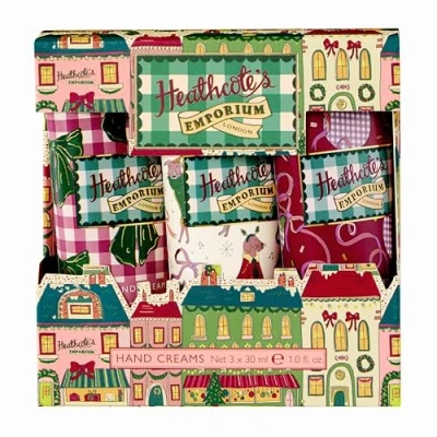 Amazon MarketplaceWelcome to Heathcoteís Emporium inspired by the nostalgia of Christmas with this mini hand cream trio, fragranced with essential oils of eucalyptus, lavender and patchouli with notes of fresh green leaves, lily of the valley and warm sandalwood. Intensive care for hands on the go: velvety, vegan formulations contain softening shea butter, antioxidant vitamin E and moisture-locking glycerin lovingly blended to leave skin feeling soft. Useful travel sizes: keep handy in a desk drawer, tote and one to spare. A perfect Christmas hand care gift for stockings, Secret Santa or an unexpected guest. Hand painted artist illustrations: this festive season weíre celebrating the nostalgic traditions of the Christmas season, joining the old and the new with illustrations of inviting shop windows, cosy pets in winter jumpers, robins, bows and baubles. Our hand creams are cruelty free and vegan friendly. Tubes and caps made from 51% recycled (PCR) recyclable plastic.