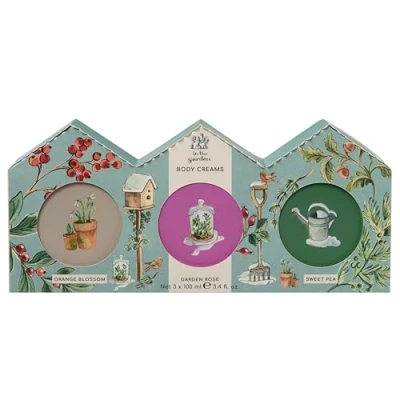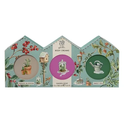 This In The Garden Assorted Fragranced Body Creams 100ml is a beautifully curated gift set of three intensive body creams, each one a nourishing treat for dry, winter skin. With uplifting garden-inspired fragrances of Rhubarb Mint, Garden Rose, and Sweet Pea, this trio is designed to put the spring back into winter and soothe skin after a day spent outdoors.Each rich, emollient cream is packed with skincare heroes: softening shea butter, vitamin E, glycerin, and pro-vitamin B5. Blended with essential oils of lime and tea tree, and extracts of elderflower, blackberry, and rhubarb, these vegan body treats are lovingly formulated to leave skin feeling soft, smooth, and comforted.Inspired by English gardens, green-fingered traditions, and the therapeutic joy of digging, planting, and pruning, In The Garden celebrates the restorative power of nature. Whether you're tending to tired limbs or simply indulging in a moment of self-care, this cruelty-free and vegan-friendly set is the perfect winter companion.