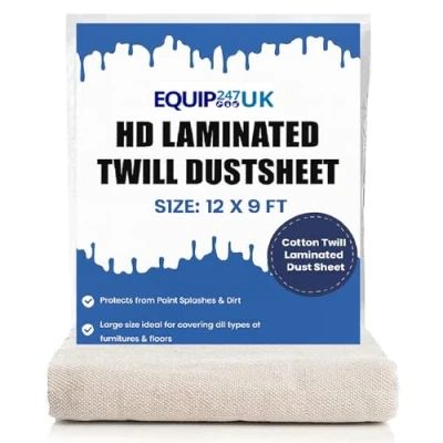 Premium Quality Double Protection - Equip247uk Heavy duty Laminated Cotton dust sheet is reversible; it has a backing of plastic sheeting that not only makes it more durable but also highly absorbent, waterproof, spillages proof, dust & dirt proof and tear-resistant Multi Purpose Usage - Equip247uk Heavy duty Laminated Cotton dust sheet for furniture, floor, stair cases; helps doing painting, wallpapering, diy, and other constructional tasks; cotton side is to catch dust and polythene side is to stop water, paints and other liquids soaking through Individually Wrapped - 1 piece of cotton dust sheets for decorating with the size of 12ft x 9ft (3.6m x 2.7m); double sided (Cotton dust sheet + Plastic sheet backed) Reusable & Easy to Clean – Built for multiple projects. Shake off dust and debris after use, then wipe the waterproof backing clean with a damp cloth. Folds down compactly for simple storage in a toolbox, cupboard, or garage. 100% Waterproof, Leak-Proof Floor Protection – Heavy-duty poly-laminated backing blocks spills, paint, and moisture from penetrating through to carpets, hardwood, vinyl, laminate, or tiles. Ideal for painting, plastering, wallpaper removal, and messy DIY jobs.