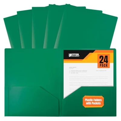 24-Pack of GREEN 0.35mm Heavyweight polypropylene folders to fit 8.5" x 11" paper/documents Durable and easily washable, the folders are slightly rigid but flexible With poly folders, there are no bent corners, rips, or tears! Two interior flat pockets and a business card slot in back pocket Great for school students, music students, home or office organizing, and any other storage use.