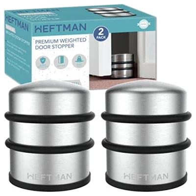 PROTECTIVE RUBBER BUMPER - These heavy duty door stoppers for floor are designed with a rubber bumper around the sides, providing optimal protection against door damage. Your doors will stay in pristine condition, free from unsightly marks and scuffs. SOLID AND STURDY - Each weighted door stop weighs 1kg, offering excellent stability and ensuring that doors stay firmly in place. With this heavy duty door stop construction, you can trust that they will provide reliable and long-lasting performance. PACK OF 2 FOR VERSATILE USE - This set includes 2 door stops indoors, allowing you to conveniently place them in different areas of your home or use them for multiple doors. It's a practical solution for securing door weight and preventing accidental slams. STAINLESS STEEL DOOR STOP - Crafted from high-quality stainless steel, each heavy door stopper is built to withstand daily use and resist corrosion. Their sleek chrome finish adds a touch of elegance to any interior décor, complementing various design styles. FLOOR PROTECTION - Fitted with a rubber base, each metal door stop is suitable for most floor types, including hardwood, tile, and carpet. The rubber base not only prevents slipping but also ensures that your floors remain scratch-free and undamaged. (Please Note: These door stops cannot be mounted to the floor), Manufacturer: HEFTMAN