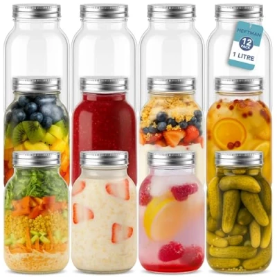 HEFTMAN Glass Mason Jars with Lids 1L Set of 12 Air Tight for Overnight Oats, Homemade Jam, Baby Food Storage, Meal Prep Jars, Pickling Large (1 Litre)