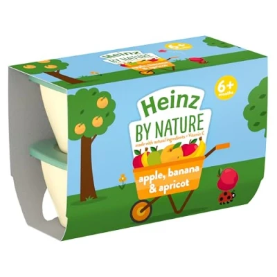 Heinz By Nature Apple Banana&Apricot baby food is a nutritious, no-added-sugar puree made from natural ingredients, enriched with vitamin C and providing 1 of your baby’s 5-a-day fruit servings. Suitable for babies 6+ months, it’s gluten-free, vegetarian, and free from artificial flavours, colours, or preservatives.