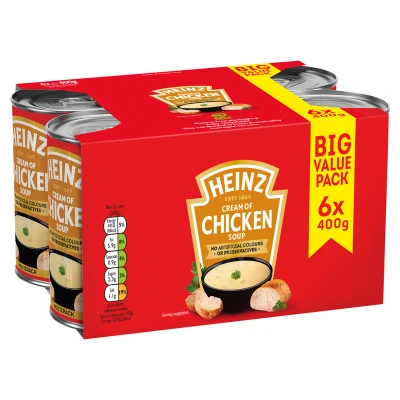 Heinz Cream Of Chicken Soup 6 x 400g: A timeless, low-fat creamy soup made with tender chicken pieces and no artificial colours or preservatives. Quick and convenient, this classic Heinz soup is delicious on its own or with crusty bread, perfect for a comforting, easy meal.