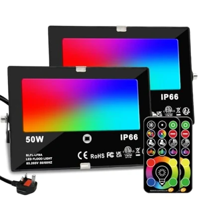 HEKEE LED Floodlight, 50W RGB Colour Changing,DIY Strobe Mode, 120 Colors, Timing, Outdoor Floodlights 5500 Lumens, 2700K Warm White, IP66 Waterproof (2 Pack)