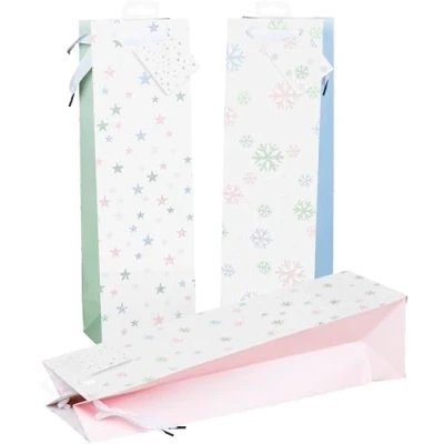 HEKU Christmas Bottle Bags with Glitter Finish, Pack of 24, Winter Pastel Motif in 3 Colours, High Quality Paper, Versatile Size for Wine and Spirits, 40 x 10 12 cm