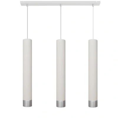 A blend of mid-century modern style and contemporary attitude the Tuba 60cm White and Wide Band Chrome 3-Light Straight Bar Pendant Ceiling Light is an eye-catching fixture to light up any space beautifully. Its elongated style is sure to make a statement while bringing soft light to a living room, dining area or entryway.