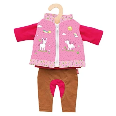 The sporty doll outfit consists of a padded vest with cute unicorn print, a soft jersey shirt in bright pink and brown breeches. The item is delivered on a wooden hanger A zip on the vest, the Velcro fastener on the shirt and the elastic jersey fabric of the trousers make it easy to put on and take off, which gives children a lot of fun while playing The garments fit dolls of size 28 - 35 cm As a traditional company, Heless pays great attention to high quality and, of course, compliance with all legal safety requirements Heless quality toys are developed with attention to design and detail. All products support creative role play and stimulate the play imagination. Playing with dolls promotes children's empathy and fine motor skills, Manufacturer: Heless