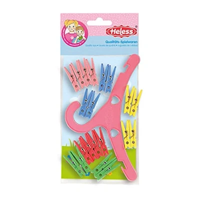 Ideal for doll's cloth Clothes pegs set contains 20 coloured clothes pegs and 1 coat hanger Made in Germany, Manufacturer: Heless