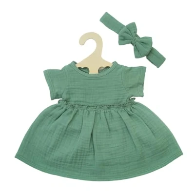 Heless 1424 100% Organic Cotton Clothes, 2 Piece Set with Dress and Headband Sage Green for Dolls Plush Animals 28 to 35 cm, 1424,