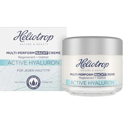 Intensively nourishing and moisturising anti-ageing night cream for radiantly fresh and plump skin, face cream with natural hyaluronic acid, suitable for any skin Result: intensive moisturiser overnight, reduced wrinkles and noticeably calmed complexion, fresh and plump skin, preventive effect against loss of tension Daily use: in the evening after facial cleansing, massage the silky, rich moisturising cream into the facial skin in circular movements NATRUE certified natural cosmetics, vegan formula with natural multi-effect hyaluronic of plant origin, algae extract and nourishing organic oils, compatibility dermatologically tested Box contents: 1x Heliotrop natural cosmetics active hyaluronic multi-perform night cream, capacity: 50 ml, made in Germany, environmentally friendly, climate-neutral packaging