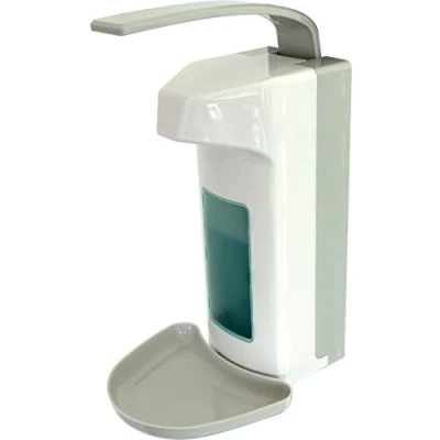 With pump lever (easy to use with hand or elbow). Robust valve technology. With drip tray and viewing window. Suitable for disinfectant column H68170 or wall mounting (material included). With 1000 ml empty bottle (Euro bottle).
