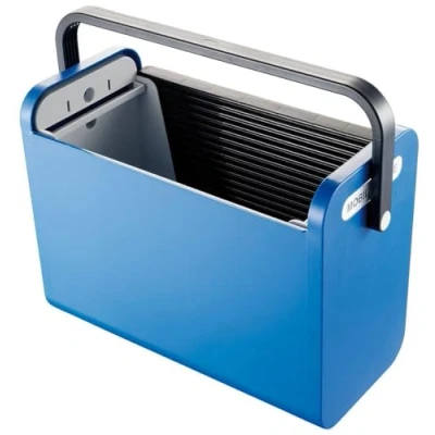 Transport box with roller blind closure for mobile office use Space for 25 suspension files or 2 DIN A4 file folders, or a combination Stackable, with labelling field With a carry handle and a rail for hanging files Opaque and matte plastic in blue/black