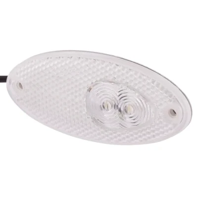 LED position reflector light for front surface-mounting (horizontal) - with ECE approval The position light has 2 light functions: Position light / reflector With 2 LEDs 12V0,3W, with seal and 5 m cable, 2 holes for fixing screws M3,5 Length: 102mm - Width: 45mm - Height: 13mm - Lamp Type: LED - Number of LEDs: 2 Light functions: 2 - with reflector/with position light (LED) ECE approved - Prot.type (IP Code): IP5K9K Housing Colour: Grey