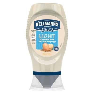 Hellmann's Light Mayonnaise is made with free range eggs Our Light Mayo has 60% fewer calories than Hellmann's Real Mayonnaise and is only 40 calories per tablespoon Hellmann’s Light Mayonnaise is the perfect accompaniment for all your meals, burgers and sandwiches Enjoy the delicious creamy taste of Hellmann’s Light Mayonnaise, made with no artificial colours, flavours, or preservatives Our mayo is suitable for vegetarians, perfect for healthy salads and tasty veggie burgers Try Hellmann's other delicious mayos including the classic Real, Light, and flavoured condiments