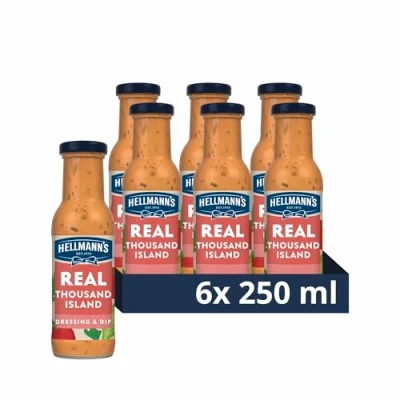 Hellmann's Real Thousand Island Salad Dressing & Dip adds that unmistakable tangy taste and creaminess This salad dressing and dip is made with real ingredients such as red pepper and tomato Hellmann's Real Thousand Island Salad Dressing & Dip comes in a 100% recyclable glass bottle This salad dressing contains no artificial colours or flavours and is suitable for vegetarians Hellmann's Thousand Island sauce is not just for salads – slather on a sandwich, make salmon sensational, produce a perfect prawn cocktail or try as a dip for chips, vegetable sticks or fish Why not try the other mayonnaises in the range, like Hellmann's Chilli Charger & Hellmann's Roasted Garlic Mayo?