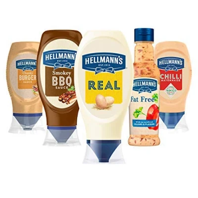 Hellmann's Sauce Variety Pack (1 x Chunky Burger Sauce 250ml, 1 x Tabasco Chilli Mayonnaise 250ml, 1 x Smokey BBQ Sauce 430ml, 1 x Fat Free Salad Dressing 210ml, 1 x Real Squeezy Mayonnaise 430ml) Product type: CONDIMENT Brand : Hellmann's