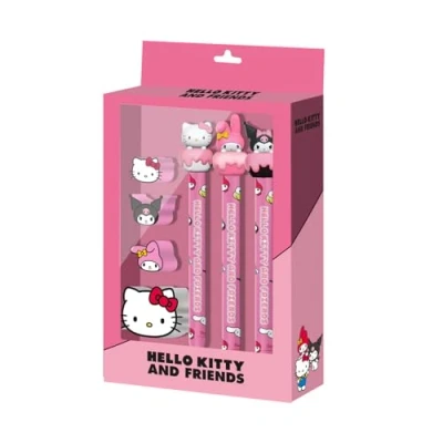 Officially licensed stationery pack, includes 3 pencils, 3 erasers, and sharpener Pencil without ink or refill, with a metal tip that writes smoothly without needing refills Rotating 3D decorative figures of Kuromi, My Melody and Hello Kitty on the top The pack comes packaged in a themed cardboard gift box Dimensions: 3.5 x 14 x 23 cm