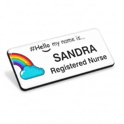 Hello My Name is Arching Rainbow Left Personalised Premium Domed Bespoke Custom Badge 76 x 32mm White/White