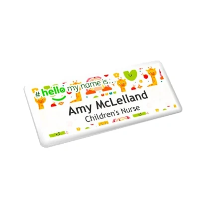 Hello My Name is Giraffe Rainbow Pattern Text Personalised Premium Domed Bespoke Custom Badge 76 x 32mm White