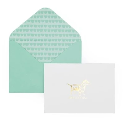 ELEGANT DESIGN: Each notecard features a charming gold-foil dachshund motif with the words “Hello You”. PREMIUM QUALITY: Beautifully printed on thick, high-quality card stock for a luxurious writing experience. BOXED SET OF 12: Includes 12 notecards and 12 coordinating blue envelopes with a stylish patterned lining, neatly presented in a gift box with acetate lid. BLANK INSIDE: Left blank for your own personal message, making the cards ideal for thank you notes. PERFECT GIFT: A thoughtful stationery gift for friends, family, or colleagues.
