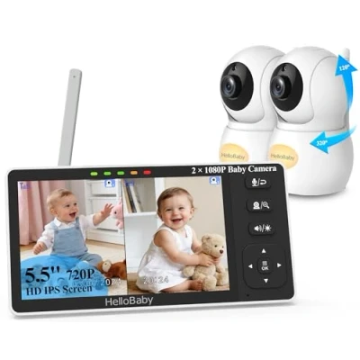 HelloBaby Baby Monitor 2 Cameras with 1080P Camera,5.5’’ Split Screen Camera and Night Vision,No WiFi,Pan Tilt Zoom,Night Light,1000ft Range,Two Way Audio,Temperature Display