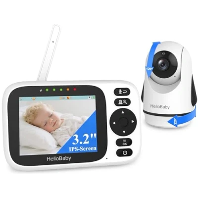 1-【Pan-Tilt-Zoom Baby Monitor with Camera and Night Vision】: 3.2-inch IPS display delivers wide viewing angle, vivid colours and clear image quality. Remote camera supports 320° horizontal and 120° vertical rotation for full coverage of the nursery. Night vision function captures your baby's subtle movements even in dark rooms, ensuring 24/7 monitoring 2-【2-Way Audio HelloBaby Monitors & Sound Activated/ECO Mode】: Built-in 2-way audio allows clear communication with your baby as if you're in the same room. VOX (Voice-Activated) mode enables the screen to automatically enter sleep state when there's no sound, effectively saving battery power for long-term use 3-【Plug & Play, No WiFi Baby Monitor for Privacy Protection】: Easy setup with plug-and-play design, no complicated operation. Rechargeable battery for the parent unit enables free movement around the house. Adopts advanced 2.4GHz FHSS technology, covering up to 1000ft outdoors (not indoor). Keep an eye on your baby anywhere at home or in the yard (screen antenna needs to be extended) 4-【Multi-Functional Smart Baby Monitor】: Equipped with ECO mode, room temperature monitoring with alarm, 8 lullabies, 8 language options, sound level LED indicators, desktop/wall-mounted installation, up to 4 cameras expansion and feeding reminder. Baby unit's speaker is on the back to avoid disturbing the baby while playing soft lullabies. An ideal gift for new parents and baby registry 5-【 1-Year Coverage 】: 1-year coverage from the date of purchase. For any questions, please contact our after-sales team via the email located on the back of the monitor screen. Enjoy fast and reliable support from our professional customer service team. An excellent choice for gifting, with the same quality guarantee for gift purchases, Weight: 1.3007273458 pounds, Manufacturer: HelloBaby