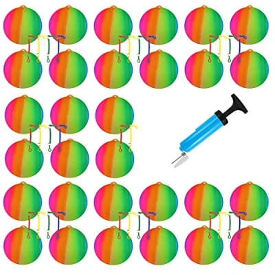 Rainbow balls with hook and spiral keyring Up to 25cm ball when inflated Spiral keyring colours are assorted Supplied flat and will need to be inflated before use with ball pump 30 x rainbow balls with hooks and spiral keyrings, plus a sports pump, Manufacturer: Henbrandt