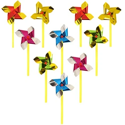 5 x brightly coloured mini windmills made from coloured foil 7cm in size, with 10cm yellow plastic stick They are available in 5 assorted colours: pink, blue, green, red and gold Colours are supplied in a randomly mixed assortment Perfect for the garden, pots, planters and for sandcastles at the beach