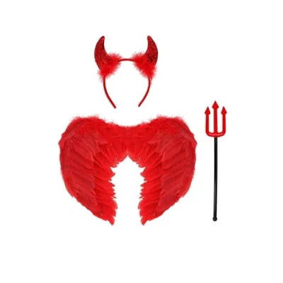 1 x Adult 3-Piece Devil Fancy Dress Costume Accessory Set, perfect for completing your look. Features vibrant red feathered devil wings measuring approximately 44cm x 34cm for a striking appearance. Includes a matching red horned headband adorned with sparkling sequins and soft feather details. Comes complete with a classic red devil fork (trident) prop to finish off your devilish ensemble. High-quality accessories from Henbrandt, ideal for Halloween, themed parties, and fancy dress events.