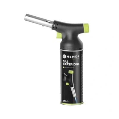 The Hendi Creme Brulee Burner / Chef's Burner - with gas canister - Jet is designed with chefs in mind. The chef's burner features a stylish matte black design with green accents and an ergonomic grip. The included gas canister easily attaches to the chef's burner. The piezo ignition makes ignition easy, and the large gas knob makes it easy to adjust the flame size and intensity. In addition, the burner works at any angle, even upside down. It also has precise flame control, up to a flame length of 150 mm. The Hendi Creme Brulee Burner comes with a gas canister included.