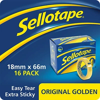The nation's favourite sticky tape. Extra strong and extra sticky. Golden in colour, but clear when applied. Easy tear, no need for teeth. Large core. Size: 18mm x 66m. Pack of 16.