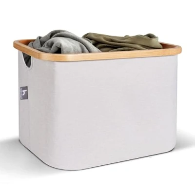 IDEAL STORAGE BOX - Perfect as a collapsible laundry basket in the bathroom or for Kallax shelves as well. The two practical bamboo handles of the storage basket make it easier to carry around. MODERN & STYLISH - The modern and aesthetic wardrobe organiser for your socks, pants, underwear can be used as a laundry hamper, wash basket, or simply as a small storage box around the house on a shelf or on the floor or under a cabinet MULTI FUNCTIONAL - Ideal storage containers for bedroom, kid toy storage, small toy box, shoe basket... or as a baby storage box. Also perfect in the bathroom as a towel storage basket, linen basket or simply a wash baskets laundry bin. DURABLE & FOLDABLE - The collapsible storage box basket bag contains bamboo details which provide stability. The small storage basket is easy to assemble. The Canvas Storage box is even strong enough for everyday use as a toybox PERFECT SIZE - Use it as you see fit, as storage cubes, foldable storage box, Kallax boxes inserts, laundry sorter or simple wooden laundry basket storage. The 40L fabric storage box [31x31x41cm] has the perfect size to capacity ratio