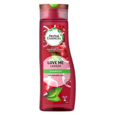 Herbal Essences Love Me Longer Shampoo with Pomegranate Essence is designed for damaged hair, offering a red berry scent and nourishing formula. It helps restore hair health and shine while being free from artificial colors, flavors, and added sugar.