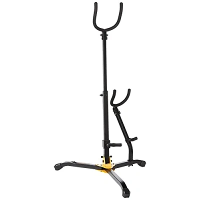 The Folding Yoke has a Locking Pin that secures the upper yoke in position. The Adjustable Backrest safely supports the instrument. Swivel Legs with Locking Pins snap securely into place, fit around other equipment easily, and fold up compactly. The Locking Pin locks the stand in place; simply press the pin to fold. Includes additional/detachable alto/tenor sax peg.