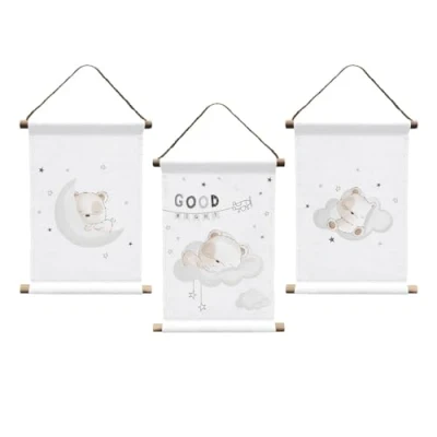 Herding babybest Set of 3 Wall Murals Sleeping Bear Approx. 20 x 30 cm 100% Cotton with 2 Wooden Sticks