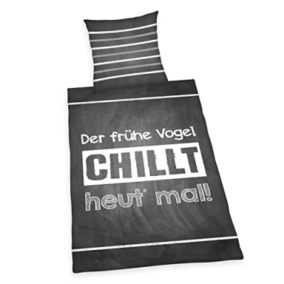 An appropriate gift idea for any occasion: Breathable youth bed linens with funny phrases Youthful 2-piece set: Varied design thanks to reversible pillowcase and duvet cover with funny sayings and striped reverse side Quick and easy to cover: Pillowcase and duvet cover with smooth-running branded zip High quality material: 100% cotton/renforcé, Produced according to Oeko Tex Standard 100, Strong colours, Easy care: Washable at 60°C, Suitable for tumble dryer Contents: 1x Herding Bedding-Set, Slogans, 1 Pillowcase 80 x 80 cm + 1 Duvet Cover 135 x 200 cm, Colour: Grey/White, Art.Nr.: 4459279050412